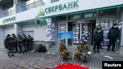 В Киеве возле отделений российских банков прошли акции протеста партии "Национальный корпус" и корпуса "Азов". Нарядившись в ватники и ушанки и взяв в руки балалайки и настойку "Боярышник", активисты расставили вокруг отделений Сбербанка плакаты "Добро пожаловать в Россию", разлили несколько упаковок с красной краской и предлагали прохожим забирать вклады из банков.