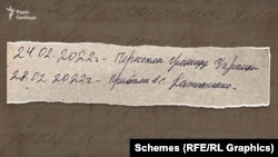 Основные записи в дневнике начинаются 13 марта – через две недели после того, как российские военные оккупировали село и обустроились в школе. Журналисты "Схем" предполагают, что тогда у них появилось больше свободного времени.