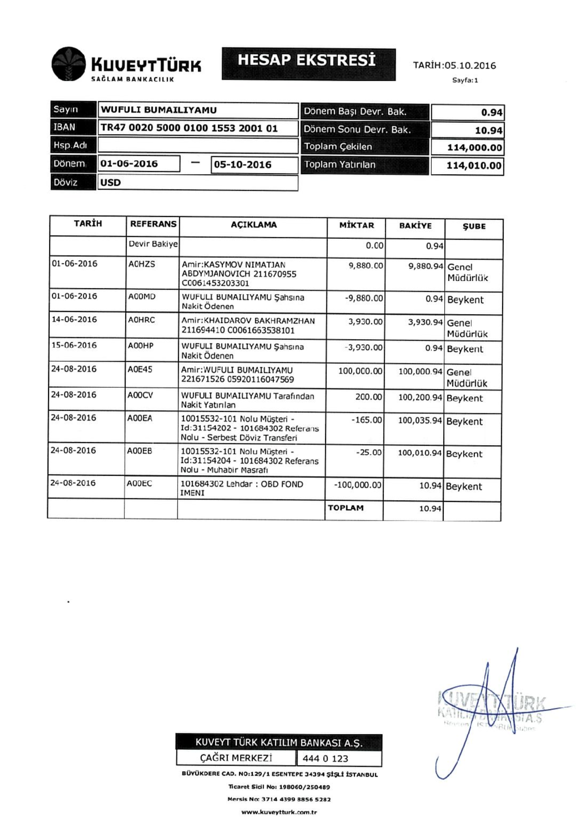 Во время одного из разговоров в сентябре Саймаити, как и прежде, настаивал на том, что переводы действительно происходили, и рассказал, как курьеры доставляли наличность в стамбульский аэропорт имени Ататюрка рейсами из Кыргызстана. По его словам, он лично забирал деньги в аэропорту, привозил их в банк, клал на счет и через несколько дней делал перевод.