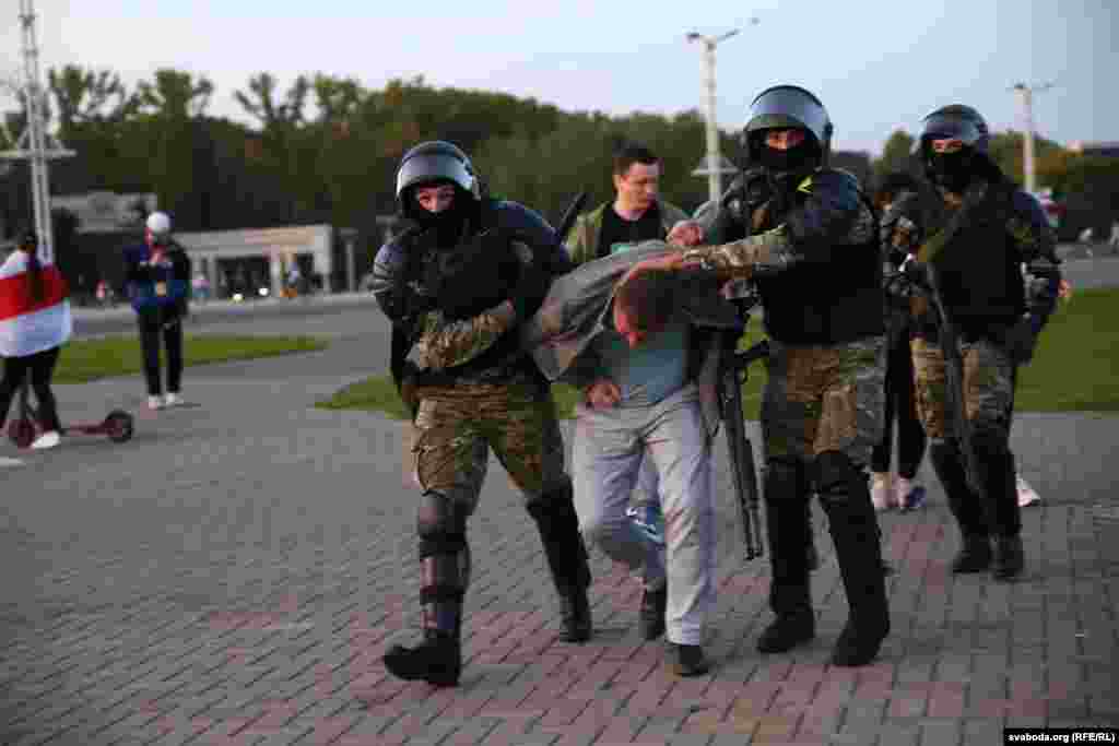К вечеру, когда у стелы "Минск – город герой" собрались около пяти тысяч человек, силовики стали действовать крайне жестко: применялись водометы с оранжевой жидкостью вместо воды, дубинки, электрошокеры, слезоточивый газ. Есть раненые